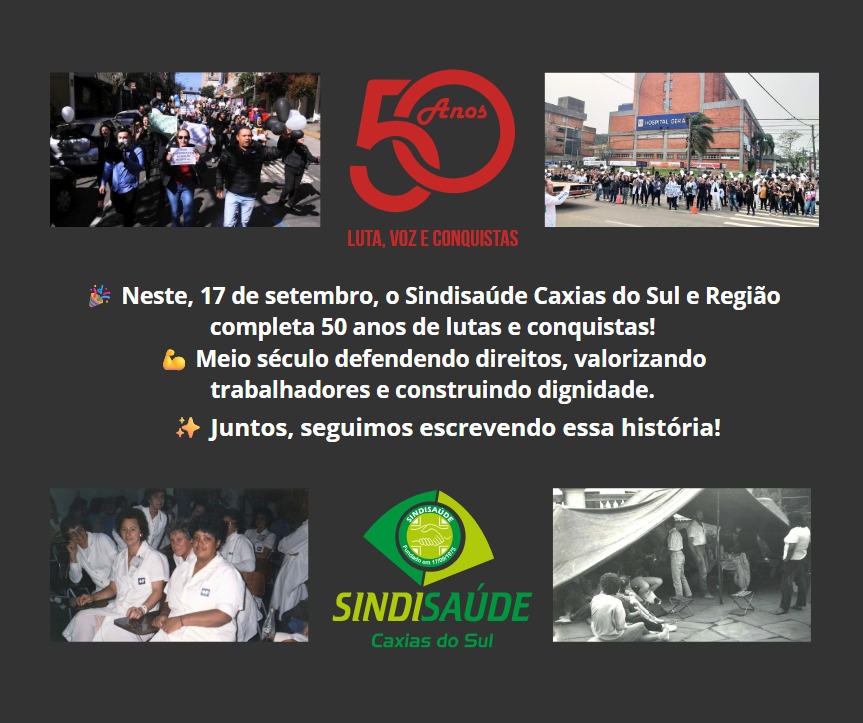 ✨ Neste 17 de setembro, o Sindisaúde Caxias do Sul e Região celebra 50 anos de existência. Uma história construída com coragem, união e a firme convicção de que os trabalhadores e trabalhadoras da saúde merecem respeito, dignidade e reconhecimento.