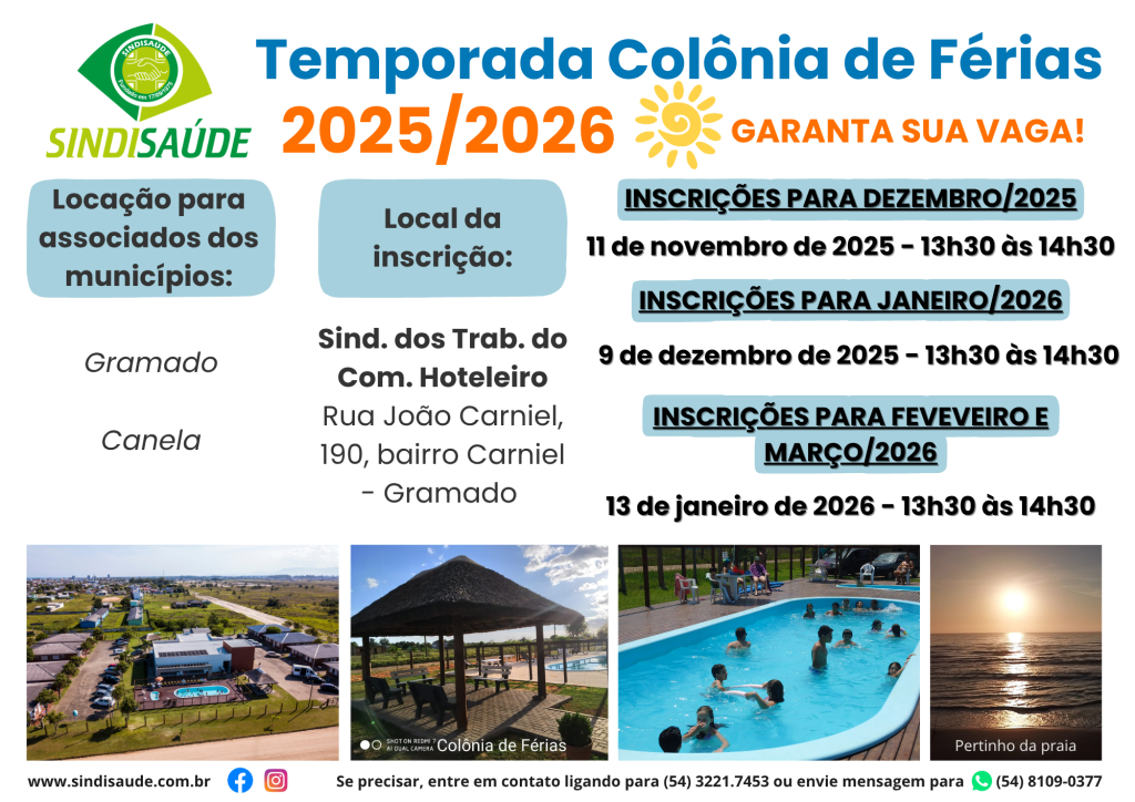 ✨⛱️ Falta pouco para o início das inscrições dos associados do Sindisaúde Caxias do Sul e Região para a nossa querida Colônia de Férias em Arroio do Sal. Um momento esperado para quem quer garantir dias de descanso, alegria e boas lembranças no litoral!