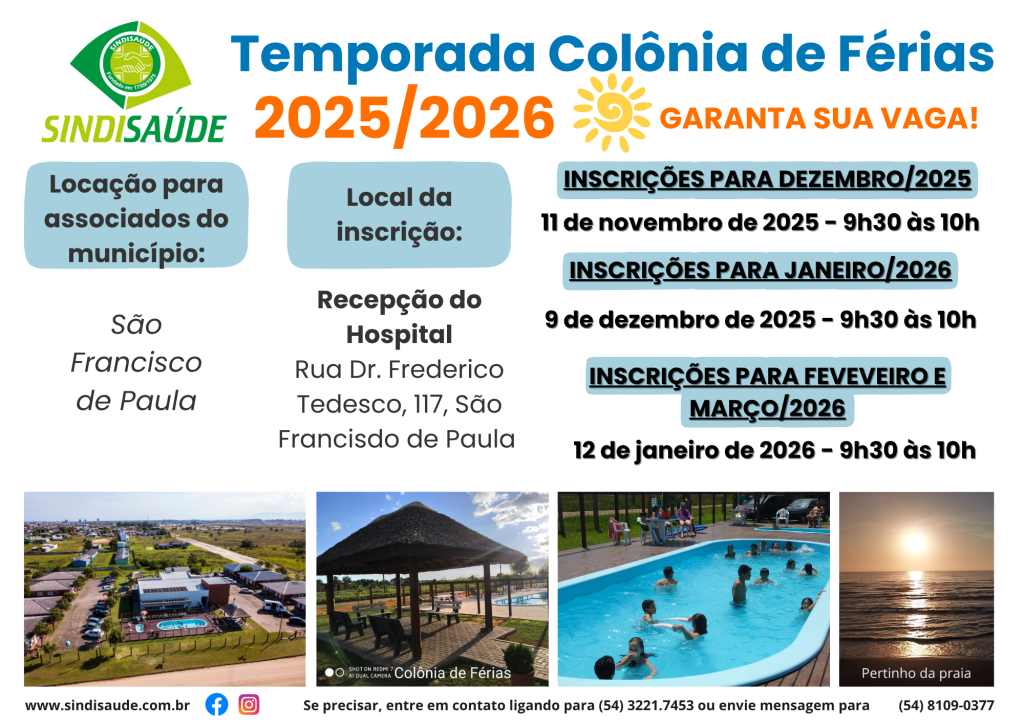 ✨⛱️ Falta pouco para o início das inscrições dos associados do Sindisaúde Caxias do Sul e Região para a nossa querida Colônia de Férias em Arroio do Sal. Um momento esperado para quem quer garantir dias de descanso, alegria e boas lembranças no litoral!