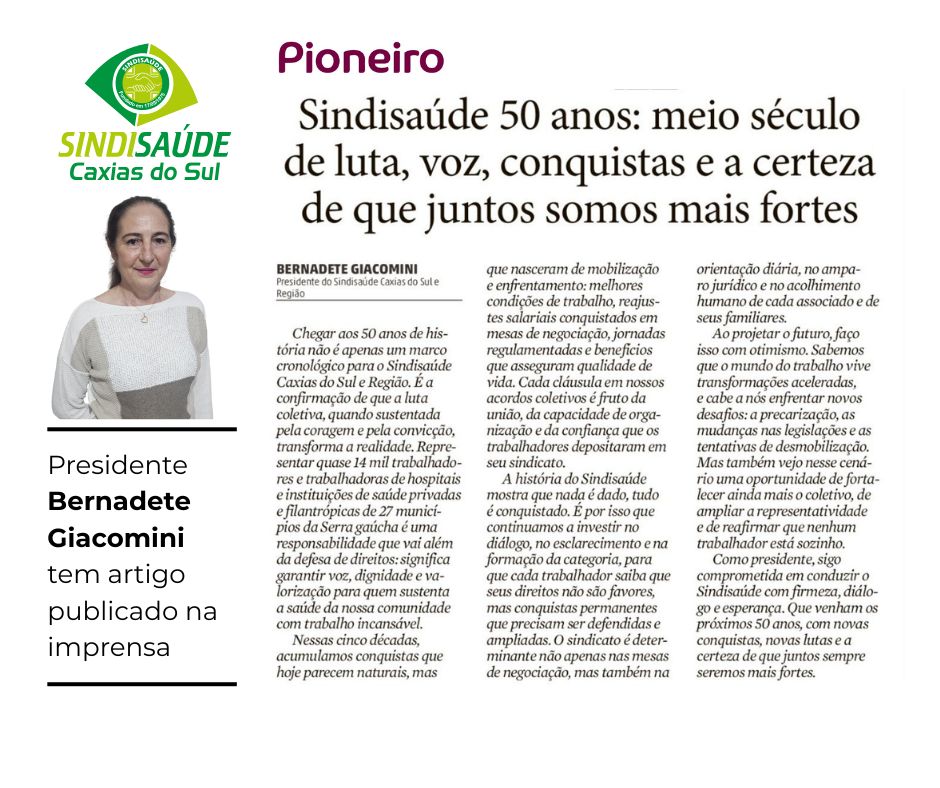 Nesta terça-feira, 7 de outubro, a presidente do Sindisaúde Caxias do Sul e Região, Bernadete Giacomini, teve seu artigo publicado na coluna Opinião do jornal Pioneiro, do Grupo RBS. No texto, Bernadete faz um resgate das lutas e conquistas históricas do sindicato, lembrando o papel essencial dos trabalhadores e trabalhadoras da saúde na construção de uma categoria unida e respeitada.